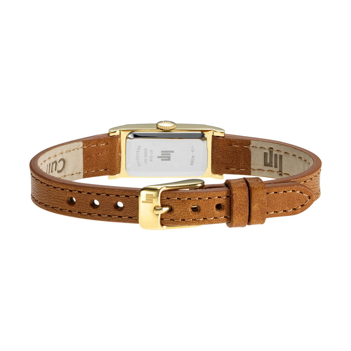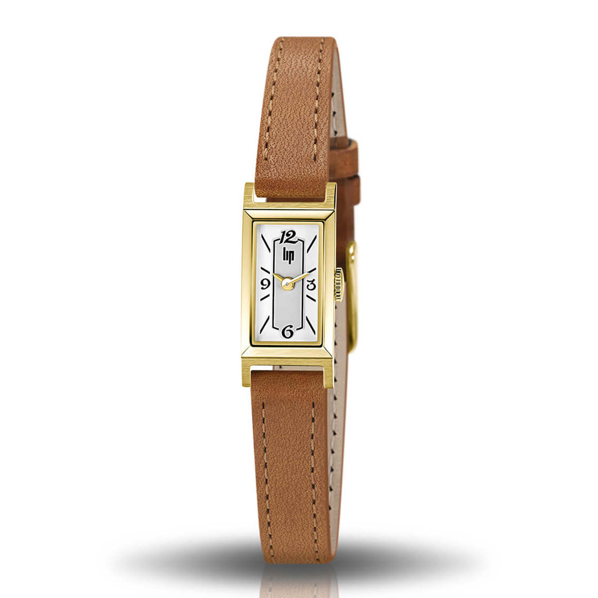LIPのChurchillコレクションから登場したT13は、繊細なデザインと洗練されたクラシックな美しさを兼ね備えたタイムピースです。13×29mmのゴールドプレート仕上げの316Lステンレススチール製ケースは、ポリッシュ&ブラッシュ仕上げが施され、光の角度によって異なる表情を見せます。