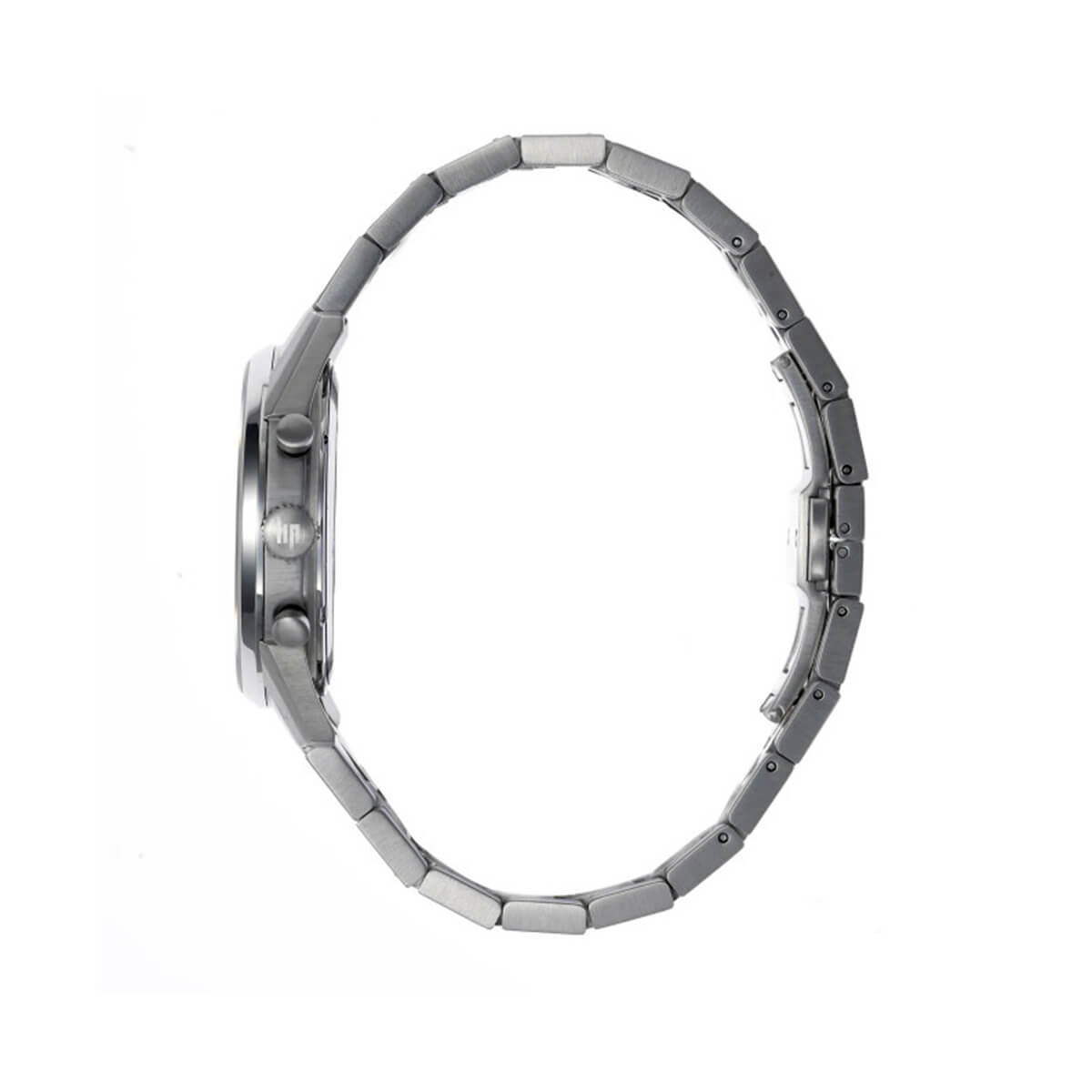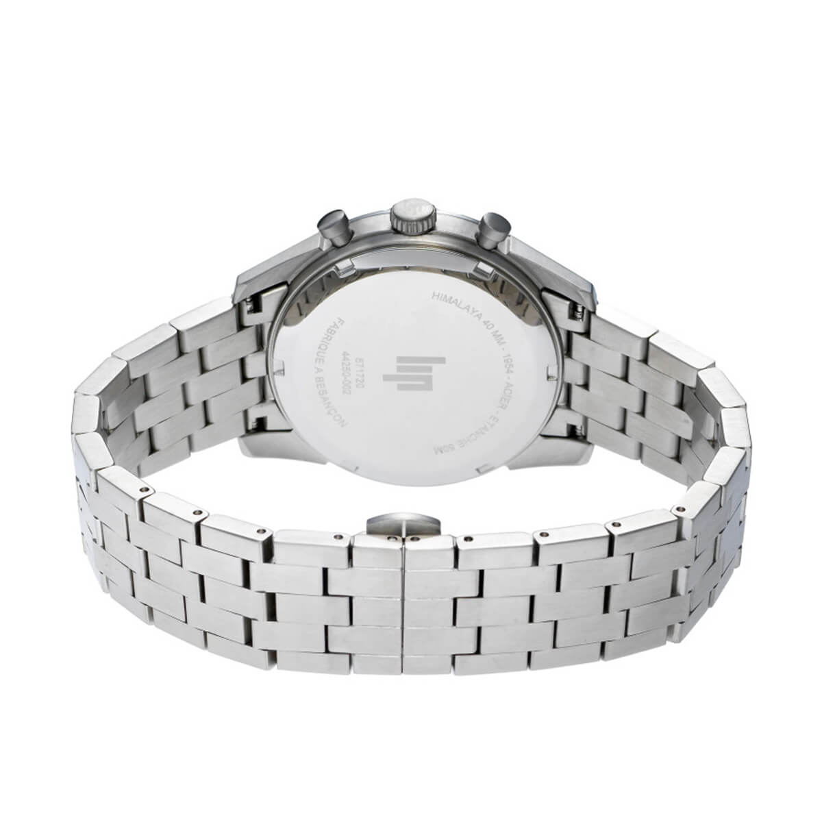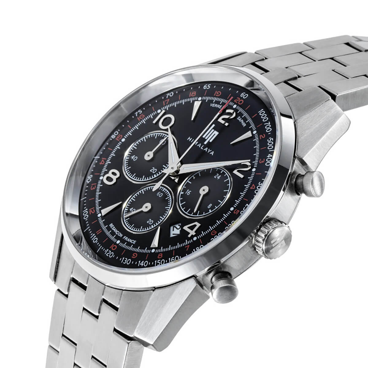 • ポリッシュ仕上げの316Lステンレススチール製ケースとブレスレットを備えた Himalaya Chronograph は、スポーツシーンから日常まで幅広く活躍するパートナーです。60分計測可能なスプリットセコンド・クロノグラフに加え、中間タイム計測、タキメーター、テレメーター、デイト表示、24時間針を搭載。反射防止サファイアクリスタル、ねじ込み式ケースバック、50m防水により堅牢性と信頼性を確保しています。ブラックダイヤルにシルバーの針とインデックスを配したフェイスは力強さとエレガンスを兼ね備え、折り畳み式バックル付きのブレスレットが安定した装着感を実現。